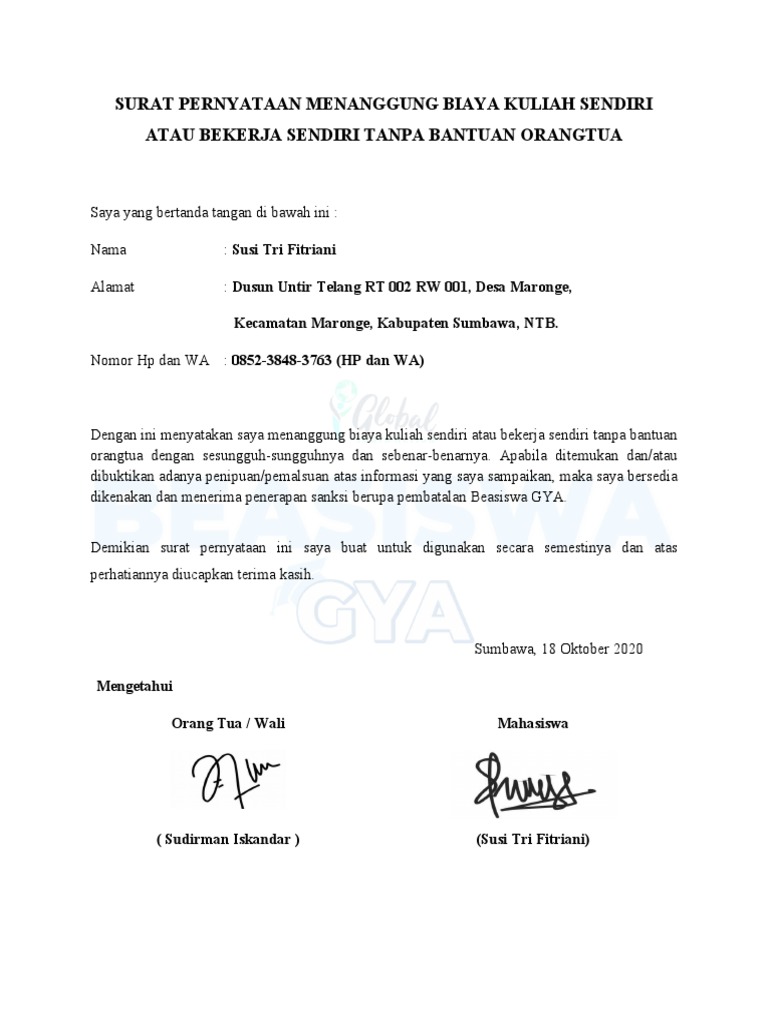 Segera daftar beasiswa gya 2020 atau global youth action 2020. Lengkapi surat pernyataan keabsahan dokumen beasiswa gya. .gya adalah surat pernyataan dari orang tua/wali mahasiswa yang menerangkan penghasilan orang tua/wali dari mahasiswa tersebut, yang digunakan untuk keperluan pengurusan beasiswa global youth action (gya). Sertifikat kegiatan akademik maupun non akademik. Global youth action adalah organisasi pemuda yang menciptakan kolaborasi antara gerakan pemuda di indonesia dengan dunia, serta mengkampanyekan sustainable development goals, dan berperan sebagai wadah untuk meningkatkan potensi anak muda. Smk ypt 2 purbalingga alamat unit kerja : Contoh surat pernyataan pertanggungjawaban keabsahan dan kebenaran dokumen. Berkas dokumen beasiswa jalur mahasiswa kurang mampu. Silahkan download melalui link dibawah ini: Berisi contoh surat pernyataan lengkap dengan formatnya. Ada contoh surat pernyataan kesanggupan, surat pernyataan kerja, surat pernyataan menikah, surat pernyataan sikap, dan lain sebagainya. Ada contoh surat pernyataan kesanggupan, surat pernyataan kerja, surat pernyataan menikah, surat pernyataan sikap, dan lain sebagainya. Demikian informasi terbaru terkait beasiswa global youth action (gya) untuk anda pelajar dan mahasiswa d3, d4 dan s1 semua jurusan.